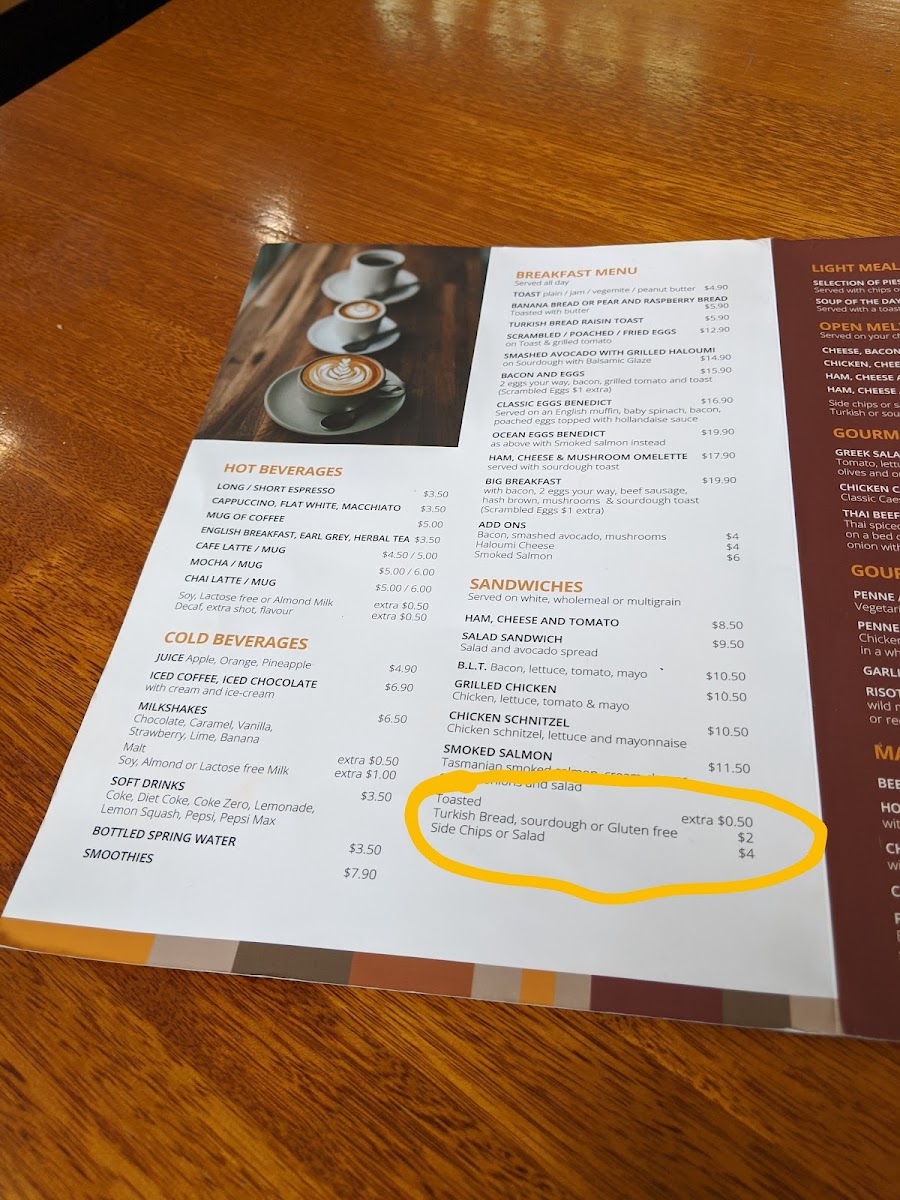 For lunch, enjoy comforting dishes like Beef Nachos and Fish and Chips, alongside delightful side options like Thick Cut Chips and Garlic Bread.
